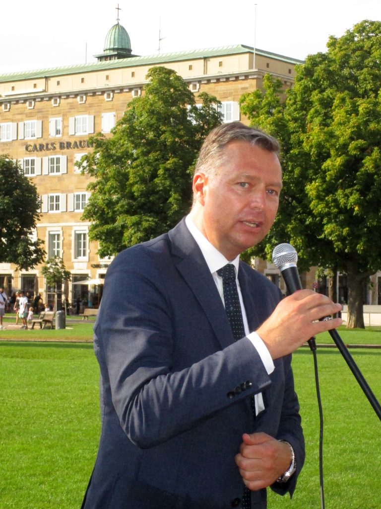 Nachdem ein starker Gewitterregen für eine kurzzeitige Unterbrechung der Feier gesorgt hatte und Reinhold Frank die Grüße des Landesverbands der Heimat- und Trachtenverbände Baden-Württemberg e. V. überbracht hatte, würdigte Festredner Stephan Mayer MdB (CSU) dann an der Gedenktafel vor dem Neuen Schloss auf dem Stuttgarter Schlossplatz, den 72. Jahrestag der Unterzeichnung der „Charta der deutschen Heimatvertriebenen“ vom 5. August 1950. Dabei machte der ehemalige parlamentarische Staatssekretär deutlich, dass die „Charta“ mit ihrem Bekenntnis auf Rache und Vergeltung zu verzichten ihrer Zeit voraus war.