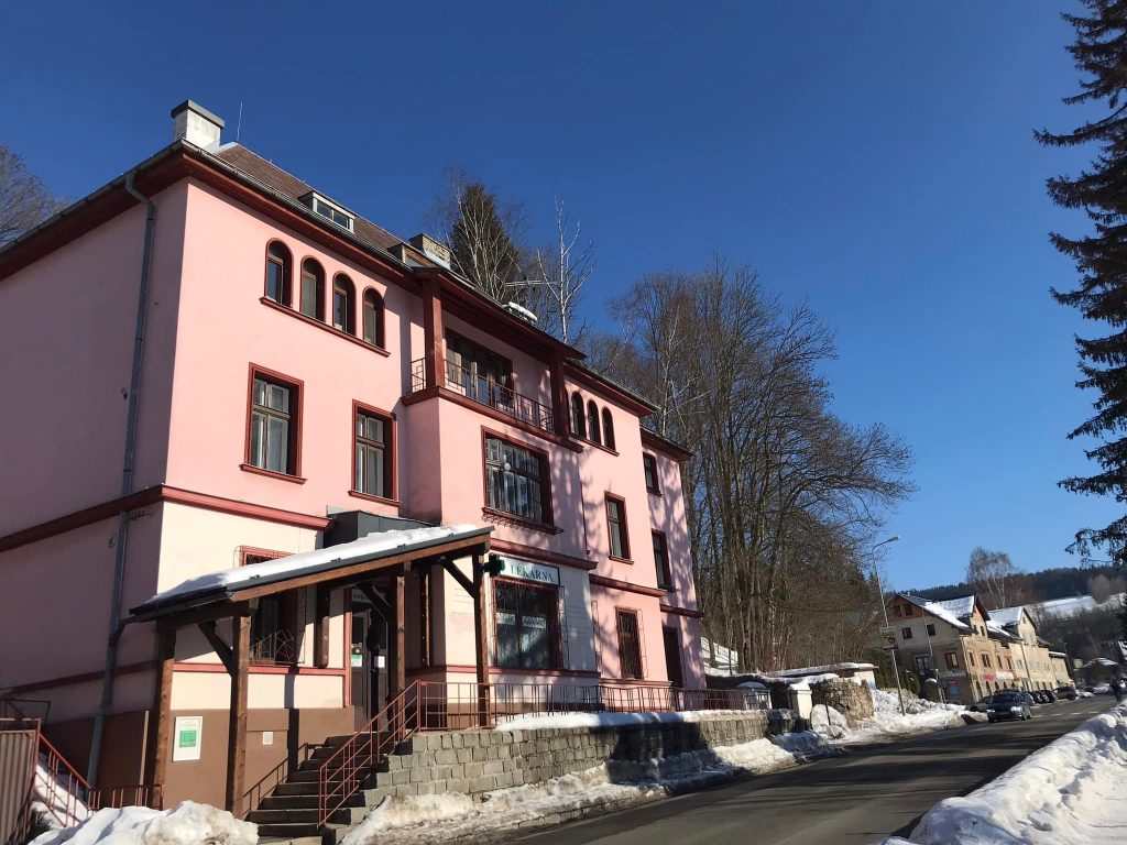 (Bild: Die ehemalige „Rübezahl-Apotheke“ in Oberrochlitz, das Elternhaus von Franz Fühmann; Aufnahme vom Februar 2022)