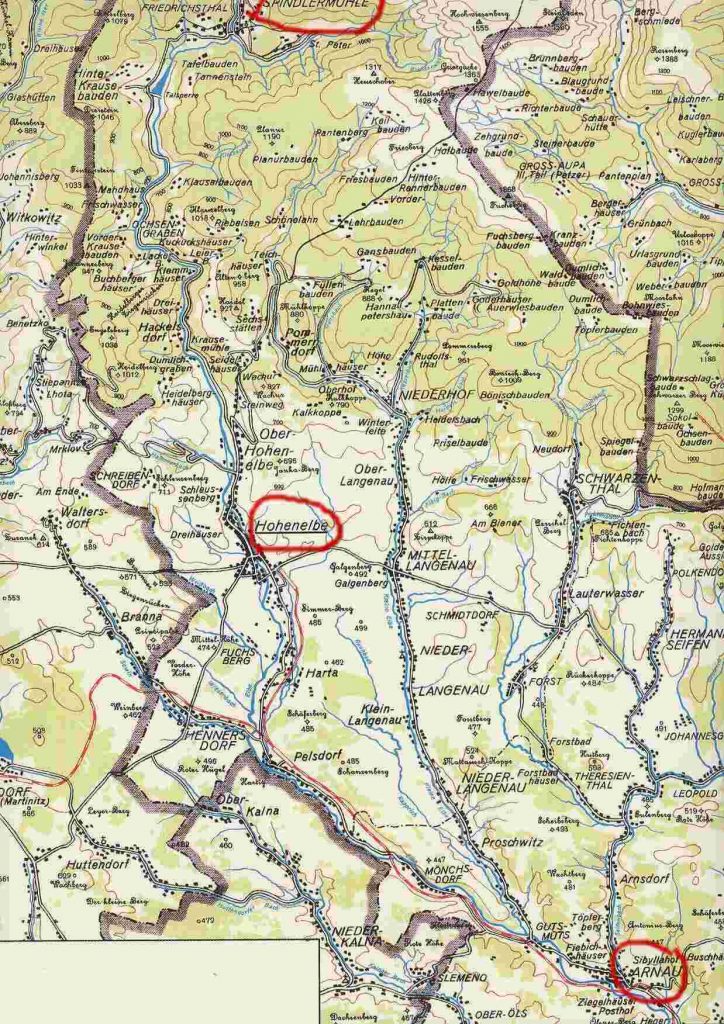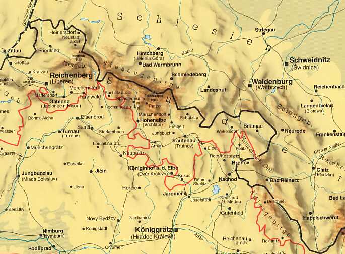 Im Anschluss sieht man auf der folgenden Karte einen Ausschnitt mit den Heimatgebieten der Sudetendeutschen im Nordosten der Tschechoslowakischen Republik; u. a. die Bezirke Hohenelbe, Trautenau und Braunau. Zu sehen ist hier außerdem die Sprachgrenze bis 1945 (rote Linie).
