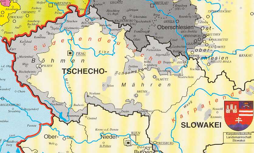 Zu sehen ist hier außerdem die deutsch-tschechische Sprachgrenze bis 1945 (rote Linie).