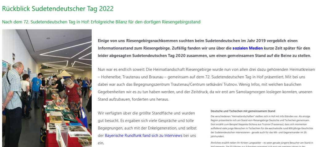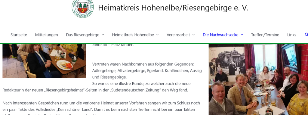 Neben den Berichten zum Sudetendeutschen Tag 2022, an dem die Nachwuchsgeneration zum ersten Mal aktiv teilnahm, und 2023 sowie dem Bericht über unsere Teilnahme am Adventsmarkt im Sudetendeutschen Haus kann man sich hier über den sehr beliebten 2023 gegründeten Stammtisch im Großraum München informieren.